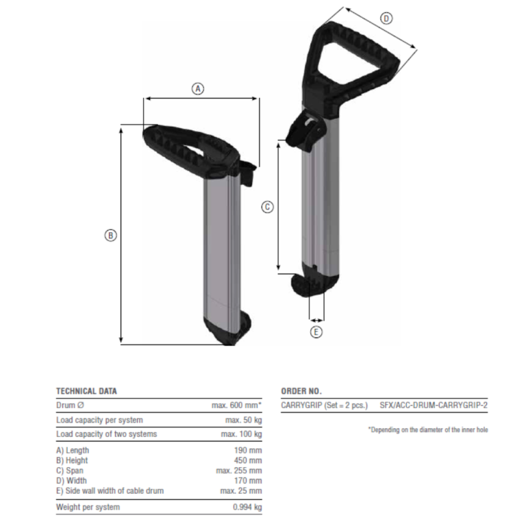 - Reliable and versatile helper for setting up and laying down cable drums: CARRYGRIP is an indispensable and reliable helper for setting up and laying down cable drums. Its sturdy single handle allows you to effortlessly and safely maneuver the cable reel into the desired position with minimal effort. This saves time and reduces the risk of injuries.