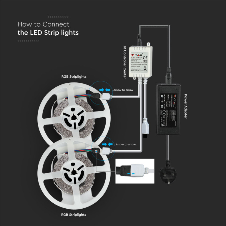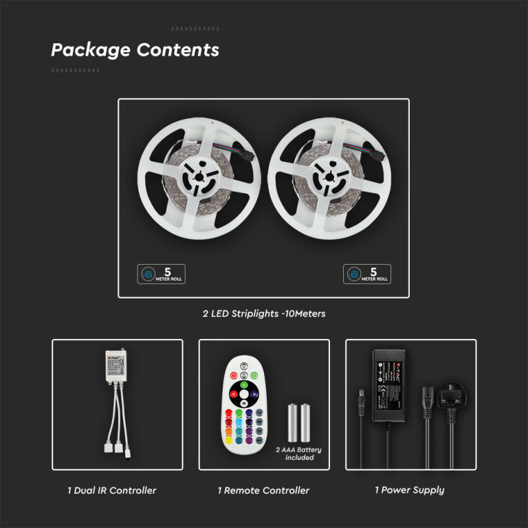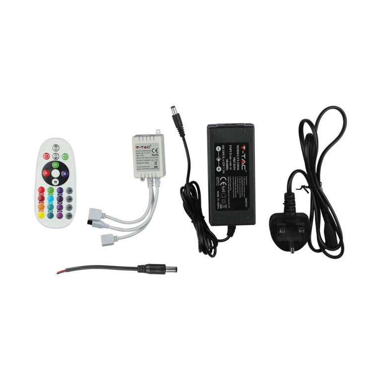 With dimensions of 8mm, this product is designed for straightforward installation and seamless integration. Built to meet professional standards, it offers a sustainable and cost-effective choice for both residential and commercial projects.- LED RGB Strip Light Kit with Power adaptor and Dual Output IR Controller