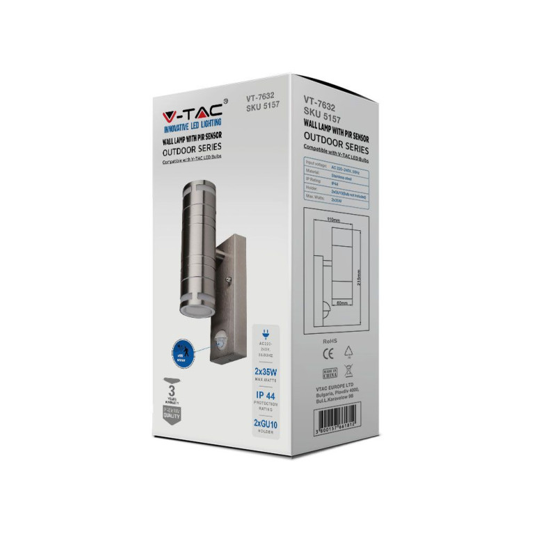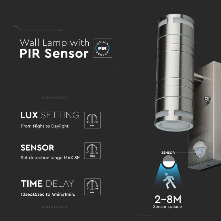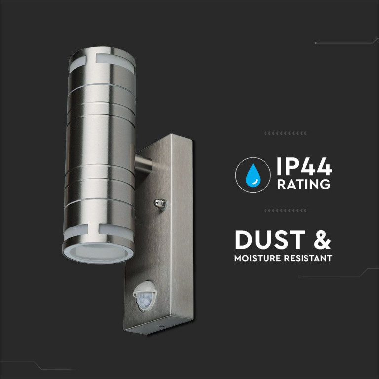 The V-TAC Glass GU10 Wall Fitting, Sensor Stainless Steel BODY(H:21.5CM) 2 Way IP44 S is a high-quality solution engineered for reliability and long-term performance. Featuring a silver finish, it offers a versatile aesthetic suitable for various modern environments. Suitable for pathways, stairways, corridors, walkways etc.