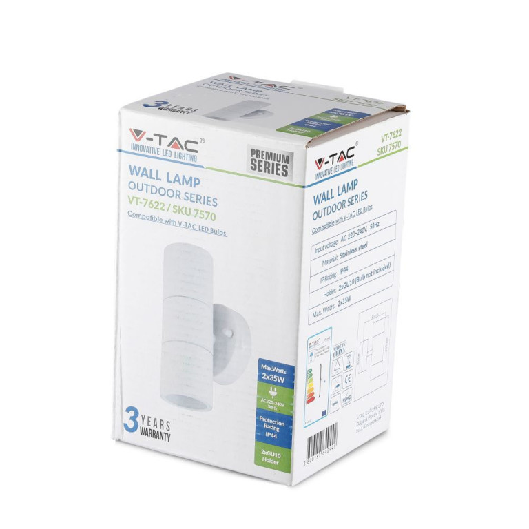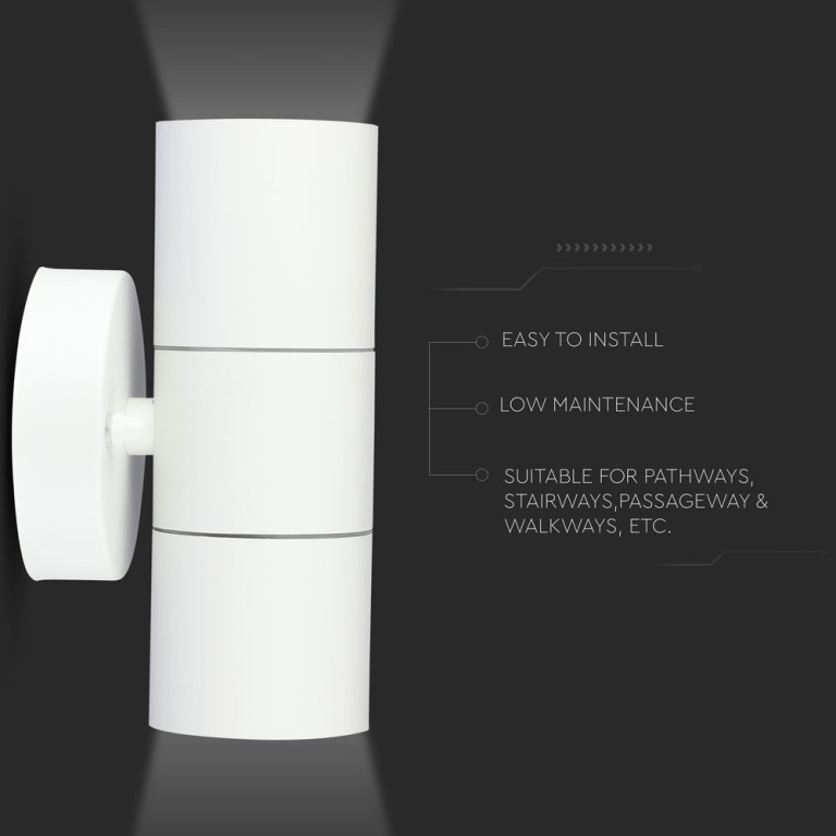 The V-TAC GU10 2 Way Wall Fitting, stainless Steel Body, IP44 (matt White) is a high-quality solution engineered for reliability and long-term performance. Featuring a white finish, it offers a versatile aesthetic suitable for various modern environments. Suitable for pathways, stairways, corridors, walkways etc.