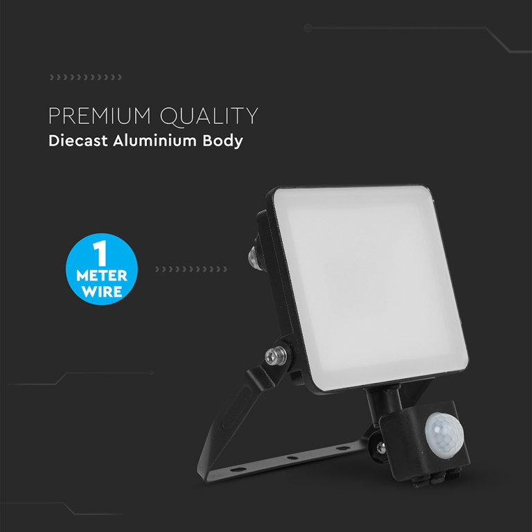 The V-TAC 50W LED PIR Sensor Floodlight 1M Wire 6500K Black Body 120LM/W is a high-quality solution engineered for reliability and long-term performance. Featuring a black finish, it offers a versatile aesthetic suitable for various modern environments. This unit is ideal for application - facade lighting, lobby, garage, passage, car park and many more.